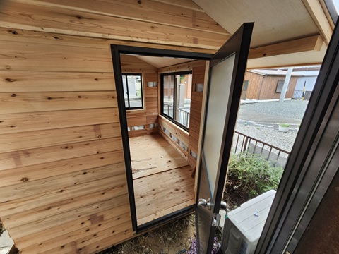 連結部に渡り廊下を設けるだけで、部屋 として使えるようになります。 ドアには鍵が掛けられます。 ここまでの画像はお施主様からいただき ました。 まだ組立途中の画像ですが、こうして 送っていただけますと安心いたします。 ありがとうございました。